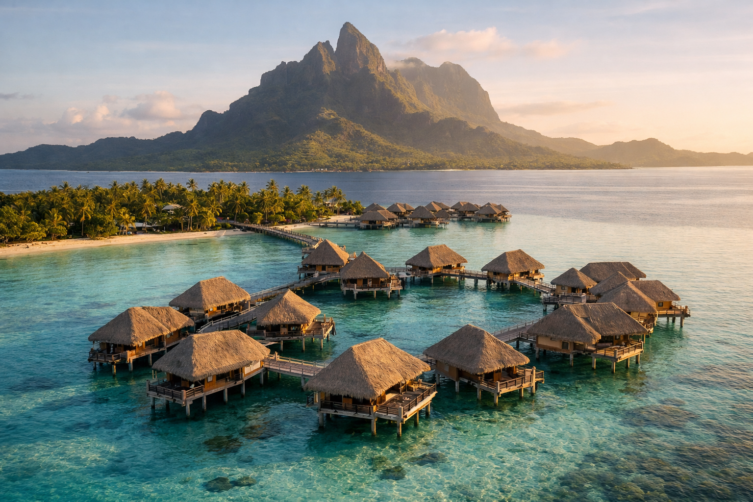 Bora Bora holds a particular claim in the honeymoon world: the overwater bungalow concept was invented here in French Polynesia in the late 1960s, and the island's lagoon—ringed by a protective barrier reef and dominated by the extinct volcano Mount Otemanu rising 727 meters—remains one of the most visually extraordinary environments on the planet. The lagoon cycles through what travel writers routinely describe as 50 shades of turquoise, and the description is, for once, accurate.